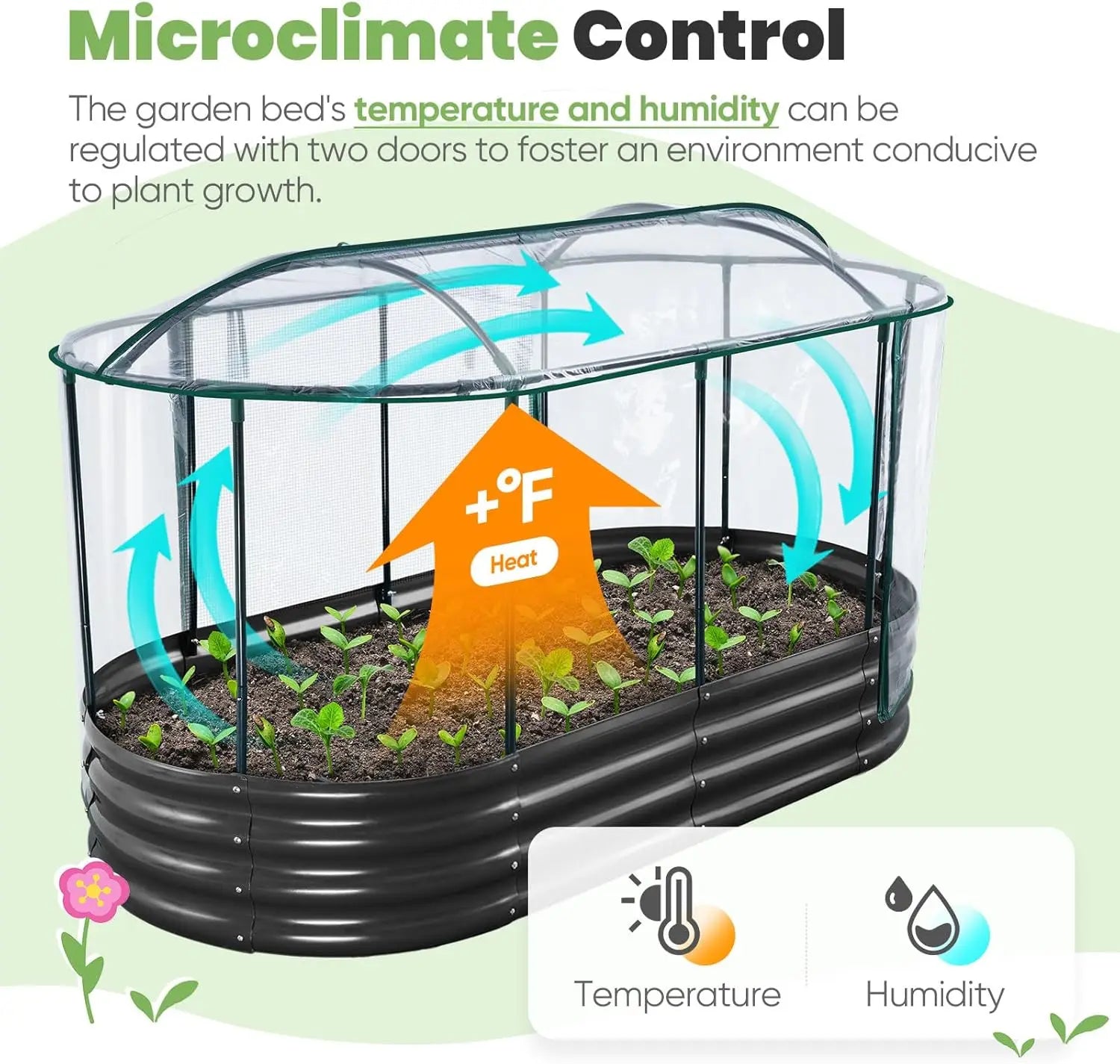 【Extending the Growing Season】This raised garden bed features a durable PVC cover that allows excellent light penetration, supporting photosynthesis and helping your plants thrive even in cooler seasons. The arched frame design provides ample internal space (reaching 36.6 inches in height), giving vegetables like tomatoes and peppers plenty of room to grow. 【Convenient Dual Zippered Doors】Two screen doors make daily plant care easy while allowing flexible regulation of temperature and humidity inside. The mesh screens ensure proper air circulation while protecting your plants from small animals, so you can enjoy your harvest without worry. 【Secure Fit and Protection】Added straps help the cover fit snugly against the frame, and extended edges at the bottom keep out pests while securing the cover effectively. This design ensures your garden stays protected in various weather conditions. 【Durable and Safe Construction】Made from sturdy galvanized steel, this garden bed is built to last for years of use. The edges are carefully rolled to eliminate sharp points, ensuring safety during assembly and planting so you can focus on enjoying gardening. 【Easy Assembly】Even beginners can set up this garden bed quickly with straightforward instructions. If you need assistance, support is available—scan the code on the packaging for additional guidance on installation and maintenance. 【Versatile Use】Ideal for growing vegetables, flowers, or herbs in outdoor spaces like yards, patios, or balconies. Its oval shape maximizes planting area while fitting well in various garden layouts. 【Maintenance Tips】Clean the cover periodically to maintain light transmission, and check straps for tightness after heavy winds. The galvanized material resists rust, requiring minimal upkeep over time.